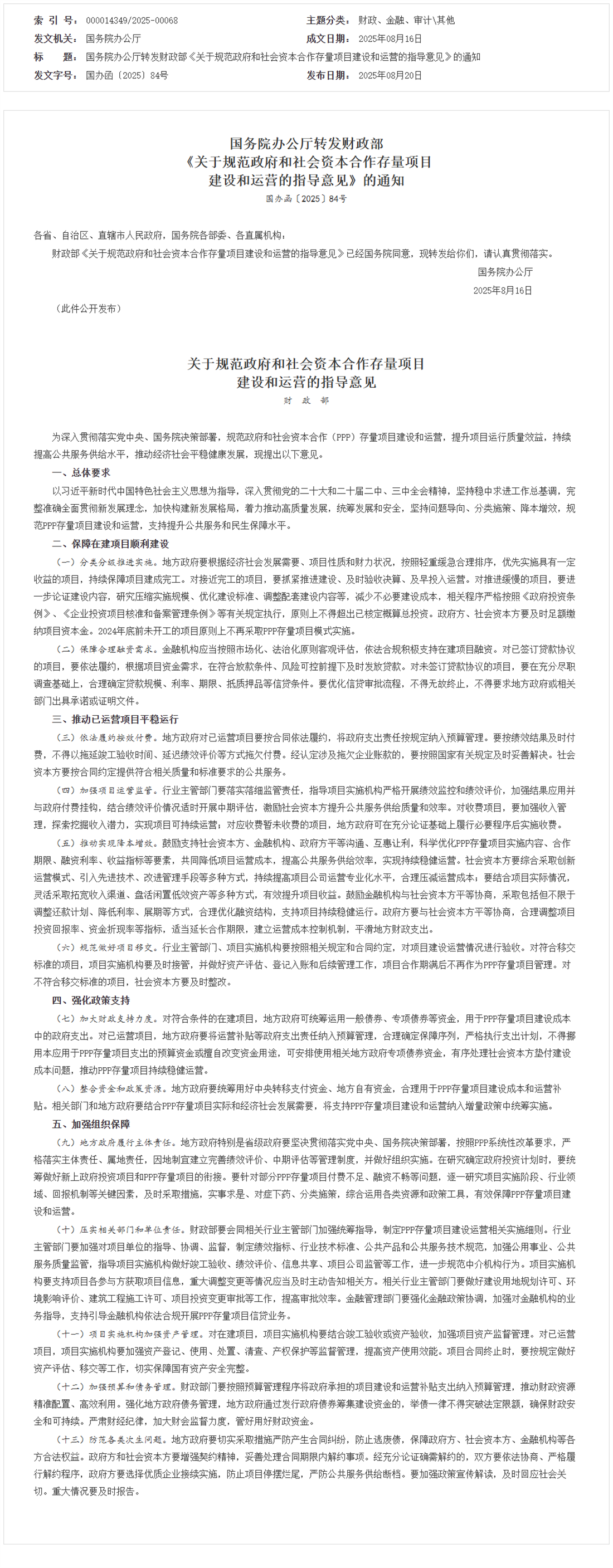 國辦轉發《關于規范政府和社會資本合作存量項目建設和運營的指導意見》
