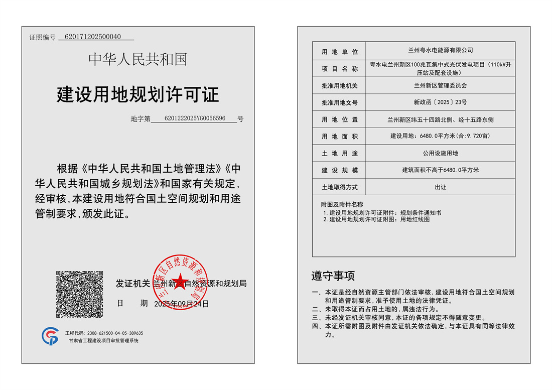 關(guān)于公示粵水電蘭州新區(qū)100兆瓦集中式光伏發(fā)電項(xiàng)目(110kV升壓站及配套設(shè)施)《建設(shè)用地規(guī)劃許可證》的公告