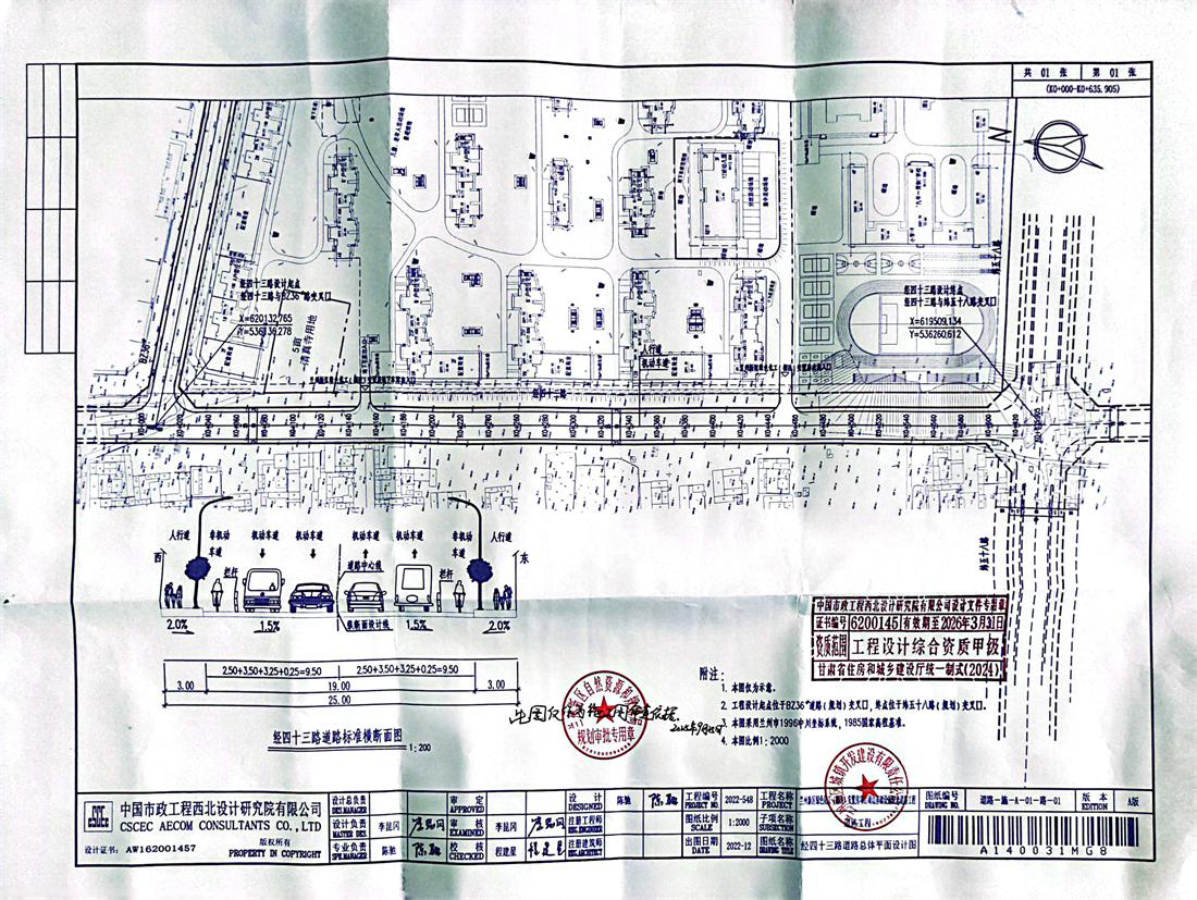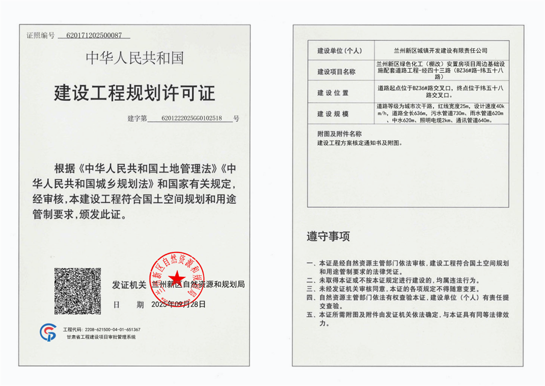 關于公示蘭州新區綠色化工(棚改)安置房項目周邊基礎設施配套道路工程-經四十三路(BZ36#路-緯五十八路)《建設工程規劃許可證》的公告